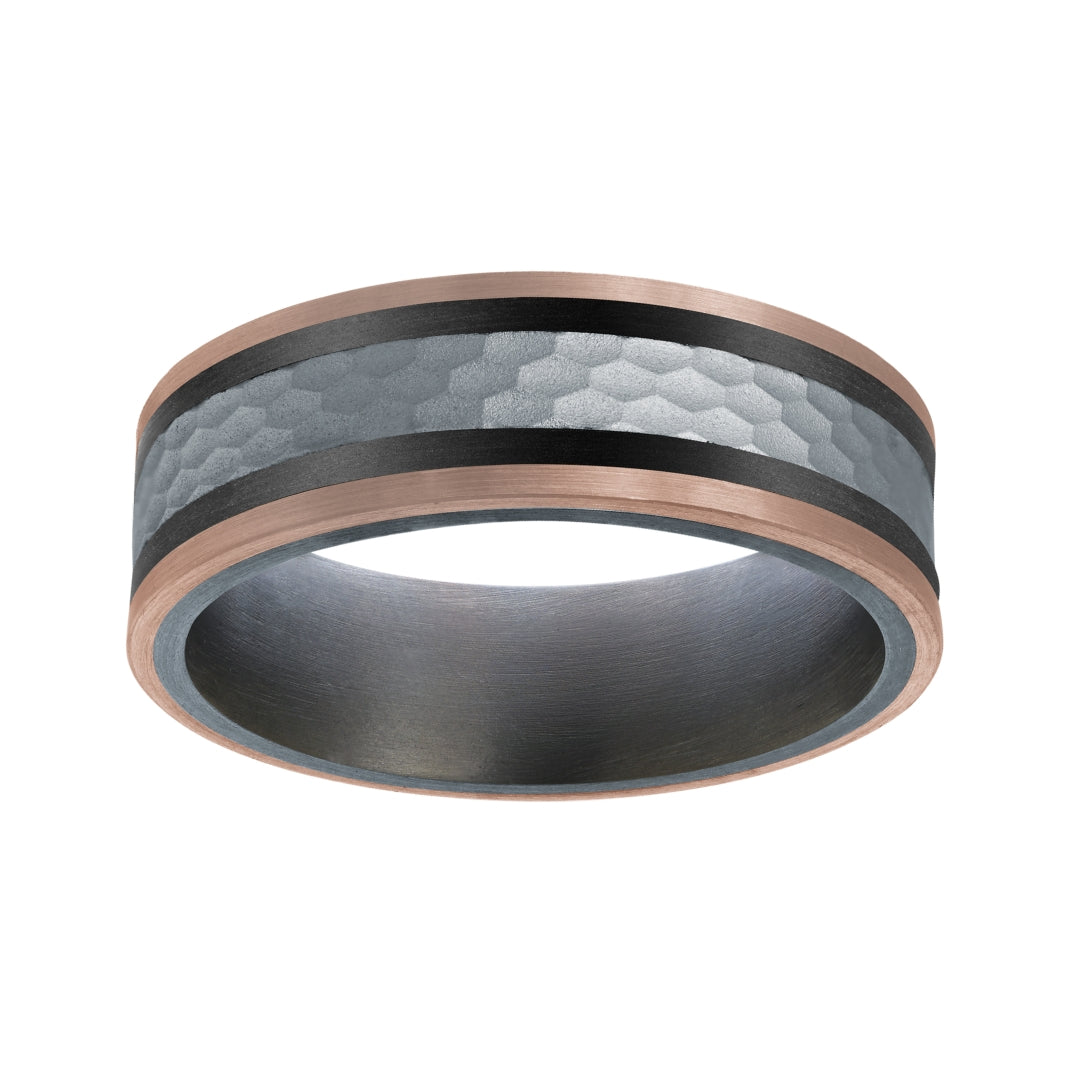 7mm comfort fit tantalum wedding band features a faceted white gold center, framed by carbon fiber inlays and satin-finish rose gold edges.