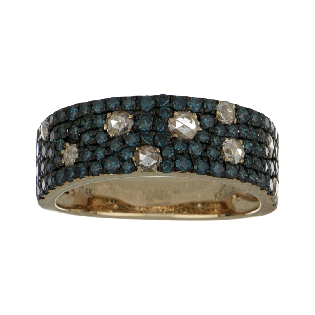 14K Gold Curved Diamond Ring with Blue and White Diamonds (Blue Diamonds 0.7 cts., White Diamonds 0.65 cts.)