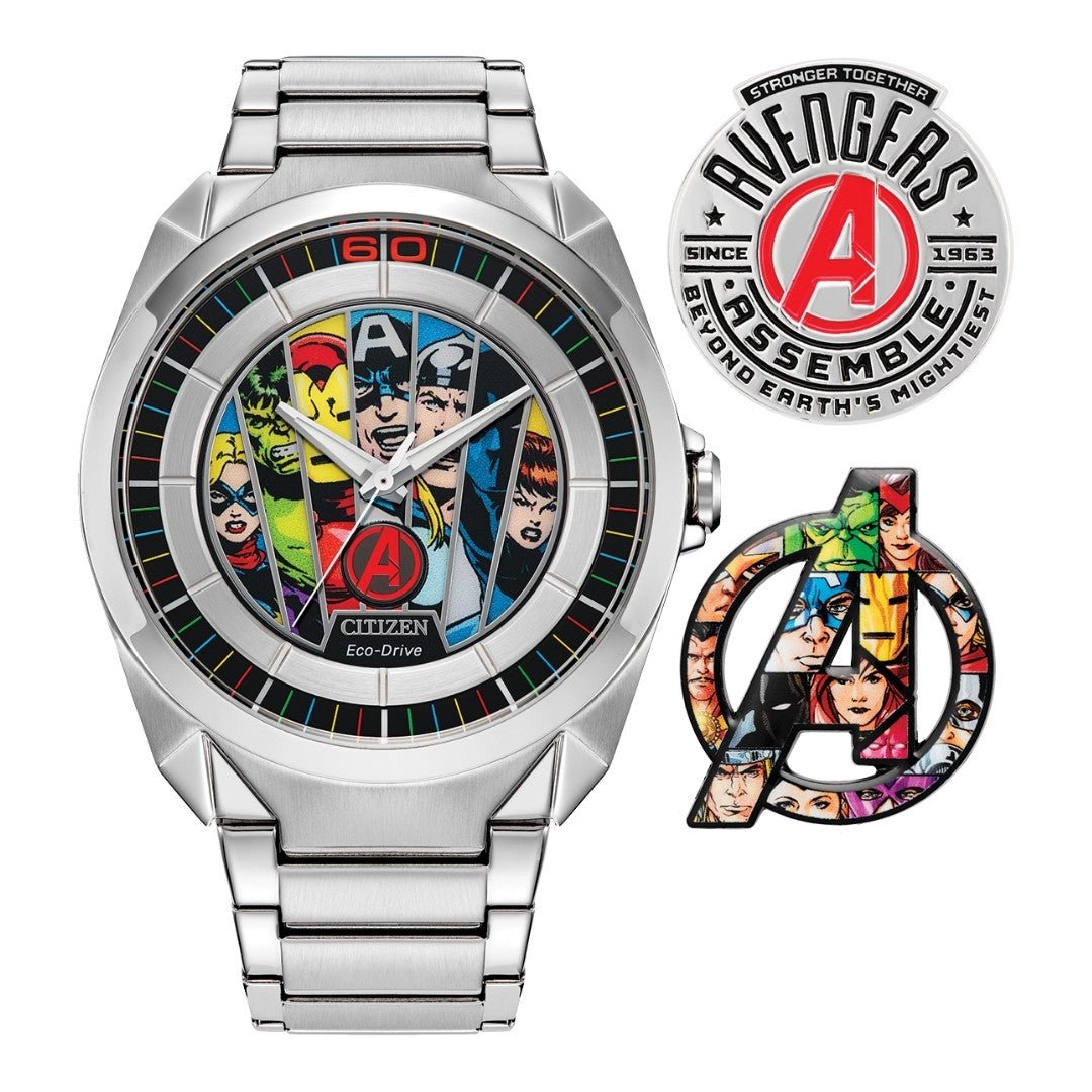 "Celebrate sixty astounding years of this unparalleled team with Marvel’s Avengers: Beyond Earth’s Mightiest watch and pin set from Citizen. Featuring Marvel’s Avengers on the dial, including Captain Marvel, Hulk, Tony Stark, Captain America, Thor, Black Panther, and Black Widow. The timepiece and unique art style highlights the first days of what has become six decades of incredible Super Hero adventures. A silver-tone stainless steel case anchors the design, with its geometric style giving the watch a tough, action-ready edge. Like the commemorative dial, the case back marks the 60th Anniversary, reading “Marvel Avengers: Beyond Earth’s Mightiest.” Sustainably powered by any light with Citizen’s proprietary Eco-Drive technology, this collector’s timepiece comes as part of a limited-edition box set with two celebratory pins.