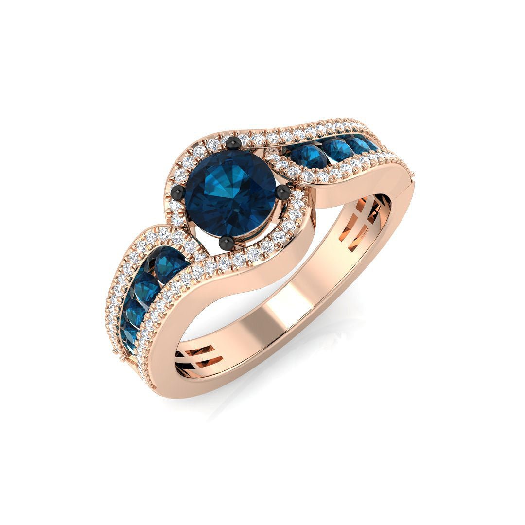 This stunning 14K gold ring features a hand crafted curve flowing design accented by sparkling round brilliant cut white diamonds (0.16 cts.). A captivating round brilliant cut blue diamond (0.55 ct.) is set in the center, with side blue diamonds of (0.35ct) creating a mesmerizing and eye-catching piece.