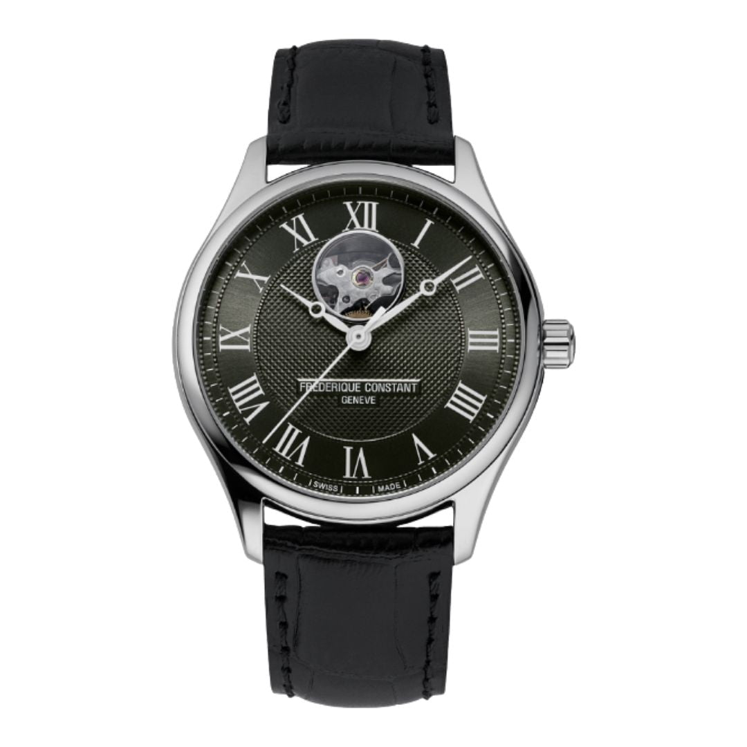 With the Classics Heart Beat Automatic timepiece, you can have it all: groundbreaking automatic movement with an aperture that reveals its inner workings, see-through case back that exposes the finely decorated movement and refined style. This timepiece has a stainless-steel case, dark grey dial with clous de paris guilloché decoration in the center, printed white roman numerals and a black leather crocodile pattern embossed strap.