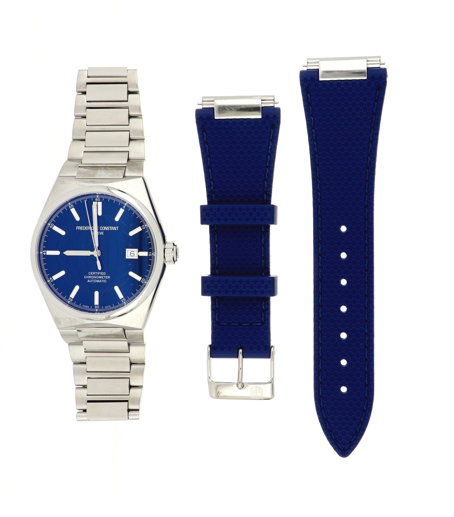 The Highlife Automatic COSC timepieces have been designed for everyday use and come in several dial and case variations. Brushed and polished stainless steel 3-part case, 41mm diameter. Navy blue dial with globe decoration, applied silver indexes, and hand polished silver hour, minute and seconds hands. 3-link brushed and polished stainless steel bracelet with an easy strap changing system. Includes a navy blue rubber strap.
