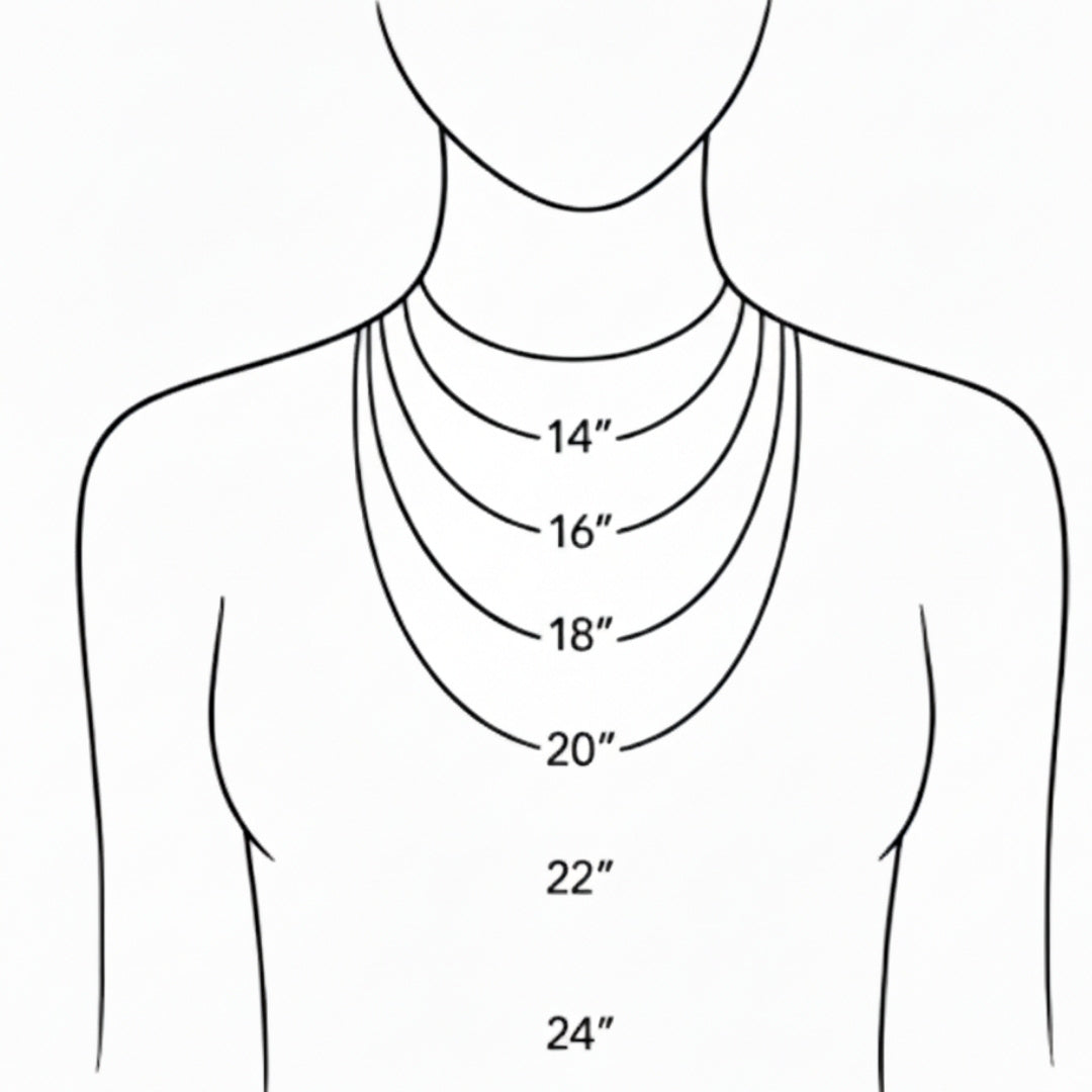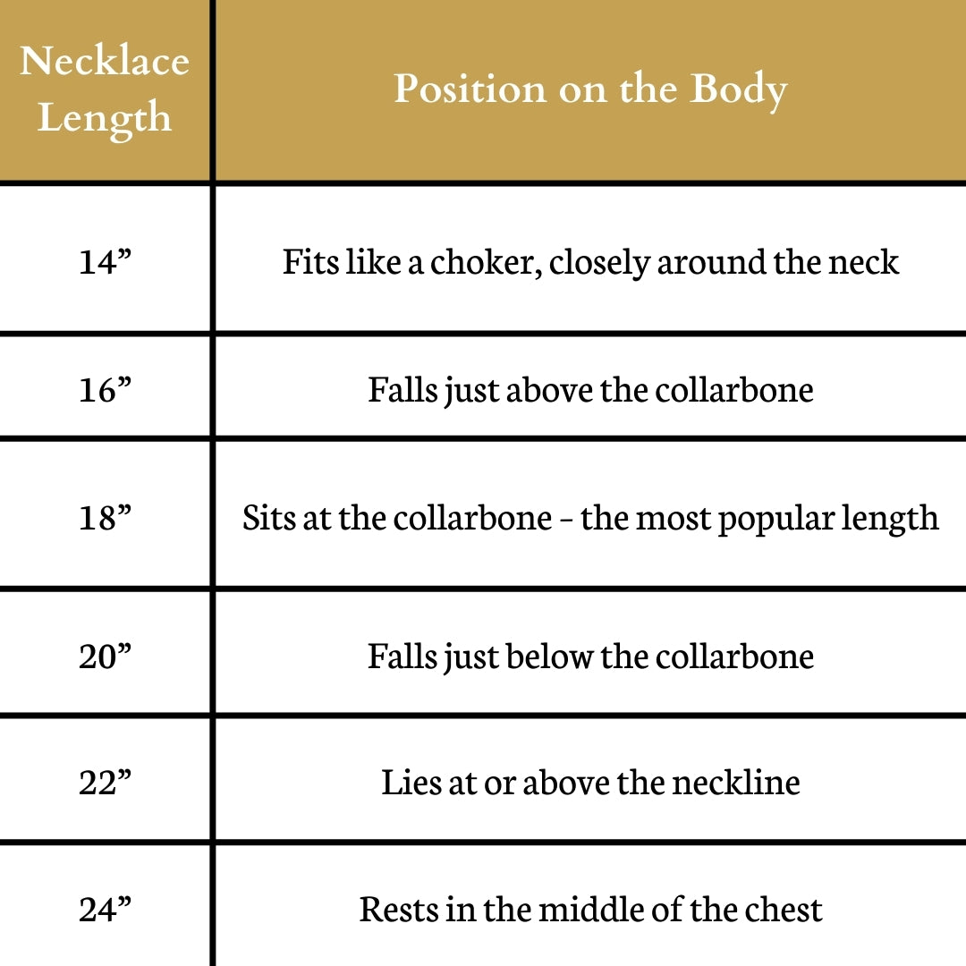 Necklaces come in a variety of lengths, from close-fitting chokers to long layers. Use the chart below to see how each size typically rests when worn.